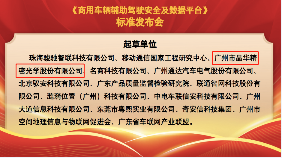2022年12月30日下午,由廣州市晶華精密光學(xué)股份有限公司作為主要起草單位的《商用車輛輔助駕駛安全及數(shù)據(jù)平臺(tái)》團(tuán)體標(biāo)準(zhǔn)正式發(fā)布,晶華光學(xué)主要起草人:宋鑫、胡文祥。
